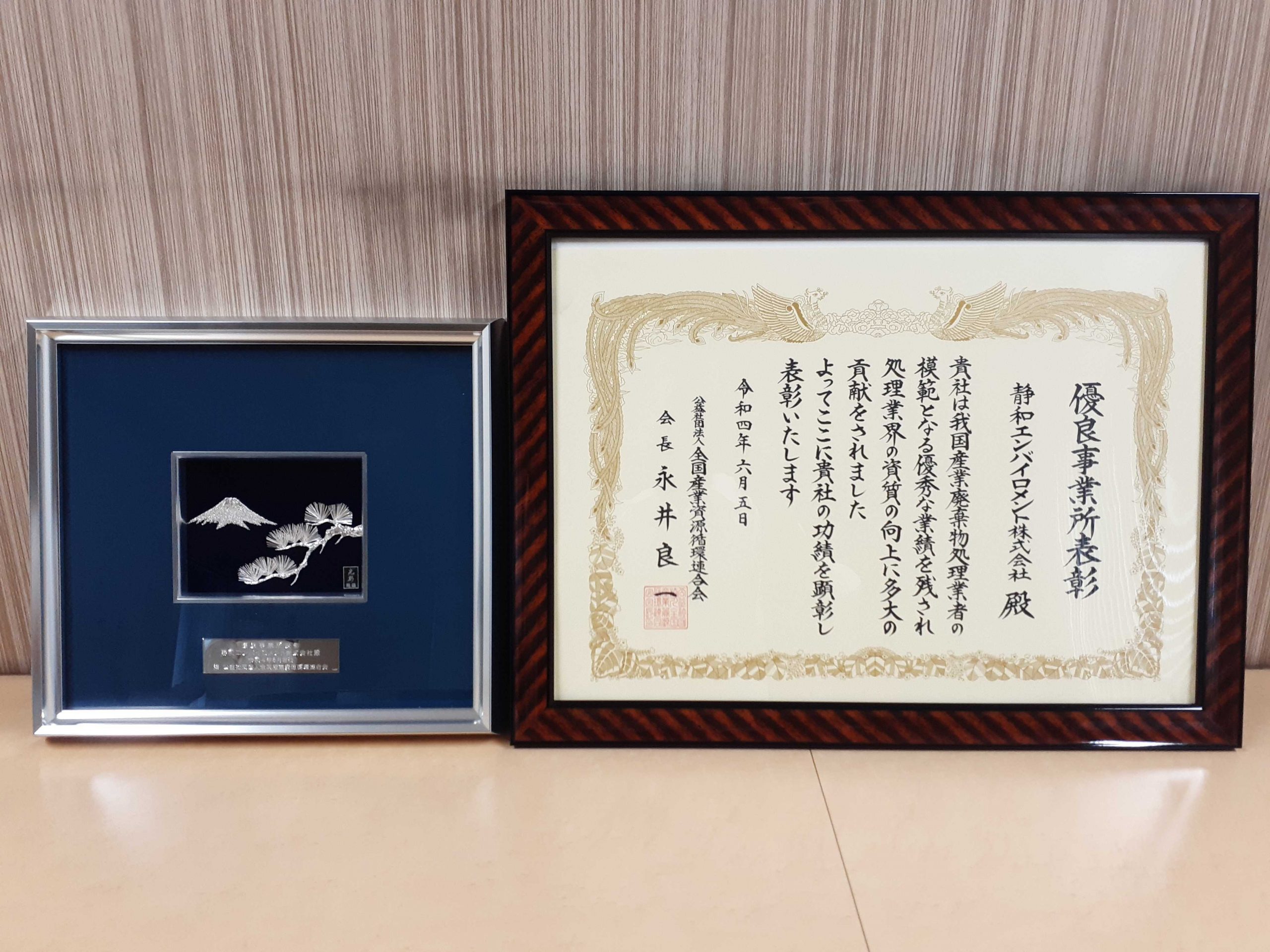 令和4年6月5日、公益社団法人全国産業資源循環連合会より、産業廃棄物処理業者の模範となる優秀な業績および処理業界の資質の向上に対して、貢献・功績が評価され、優良事業所表彰を受けました